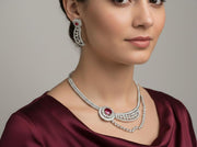 Minimal yet dazzling artificial diamond necklace set with elegant red stone detailing and cool silver polish.