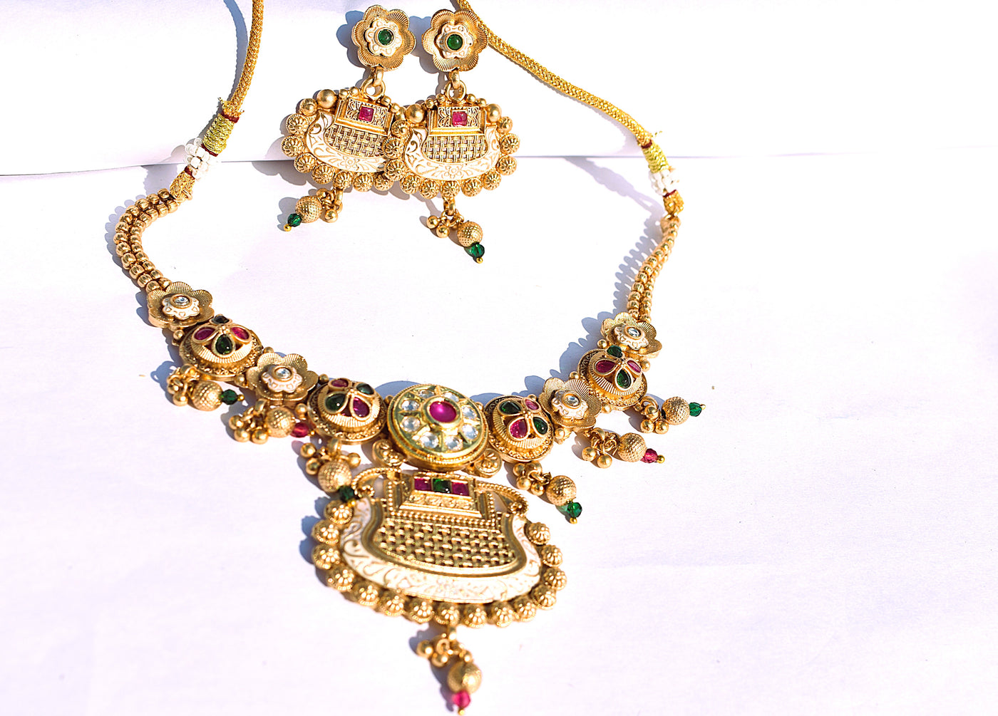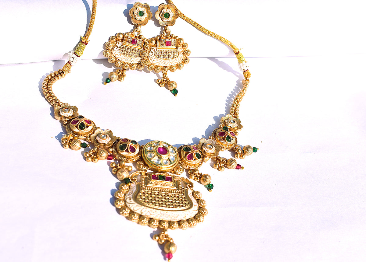 Premium heritage jewellery necklace set finished in radiant gold polish for timeless sophistication.
