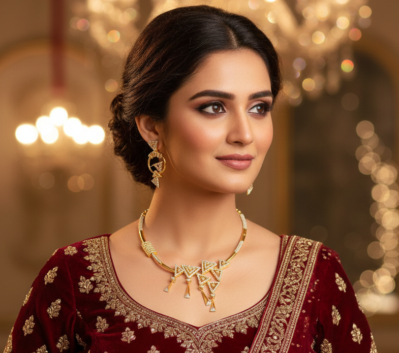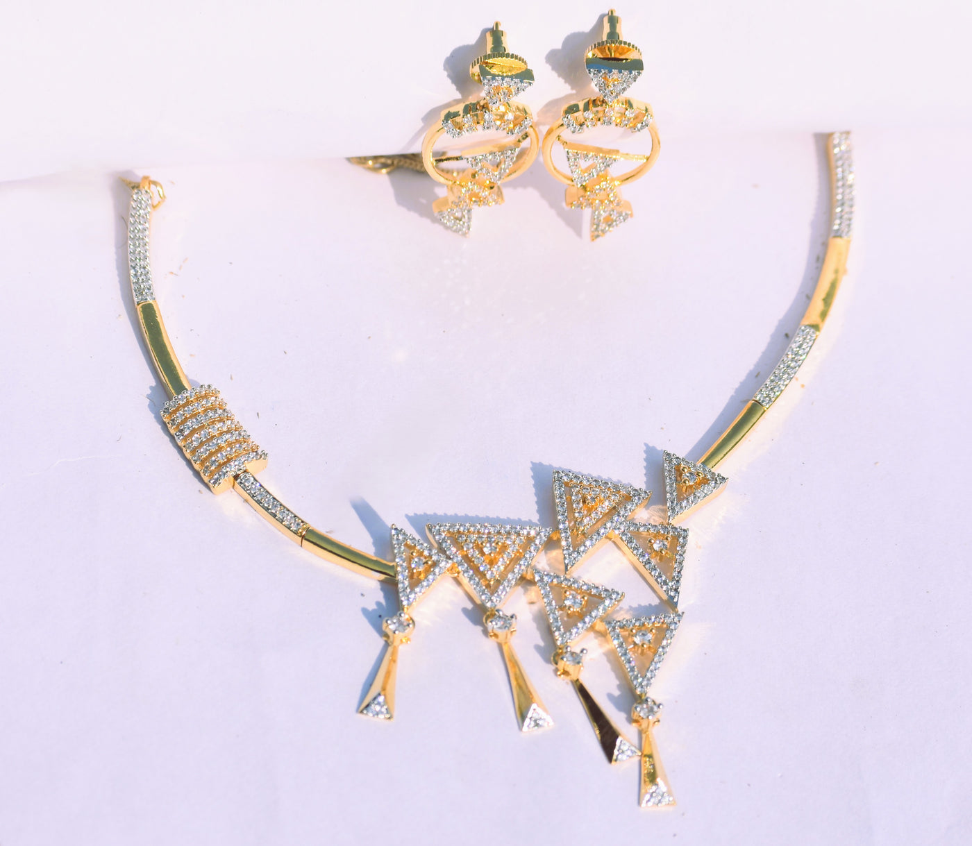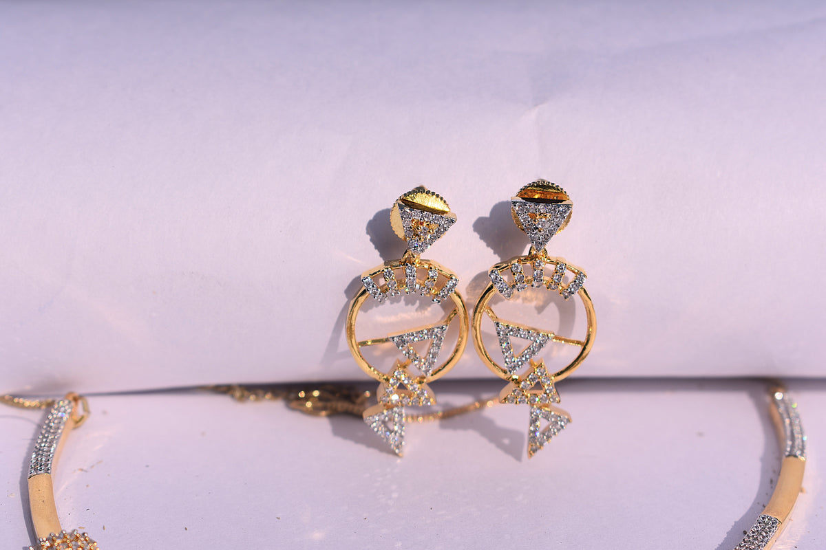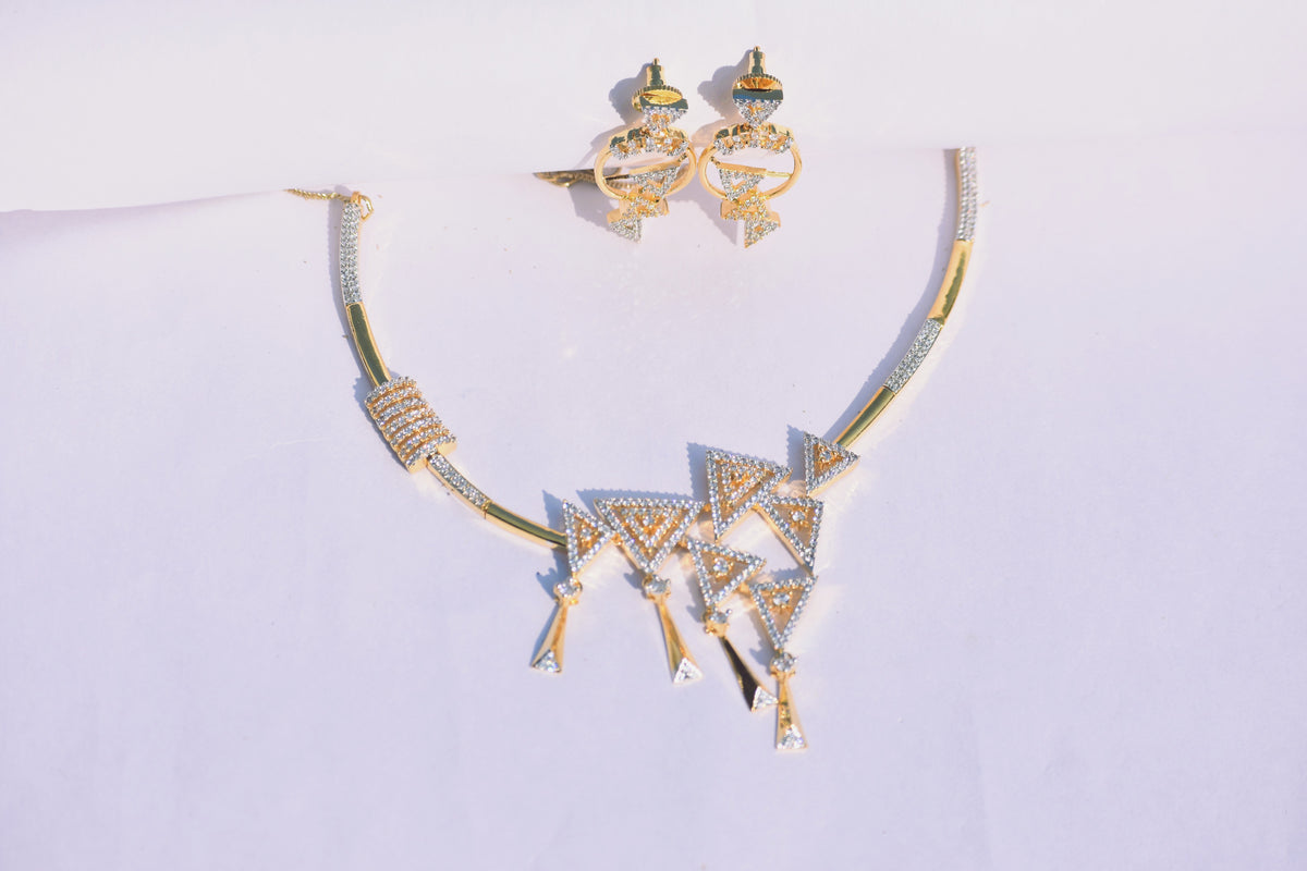 A sleek artificial diamond necklace set with brilliant white stones and a rich gold finish.