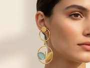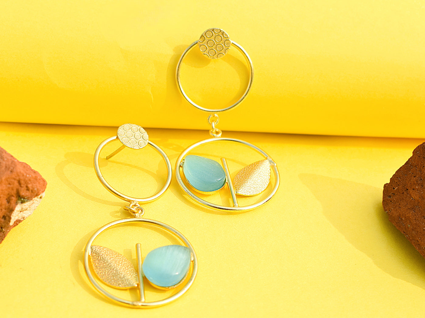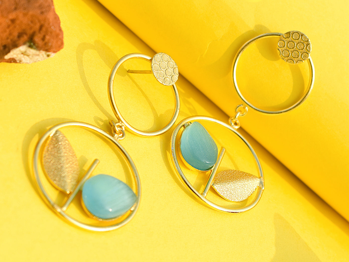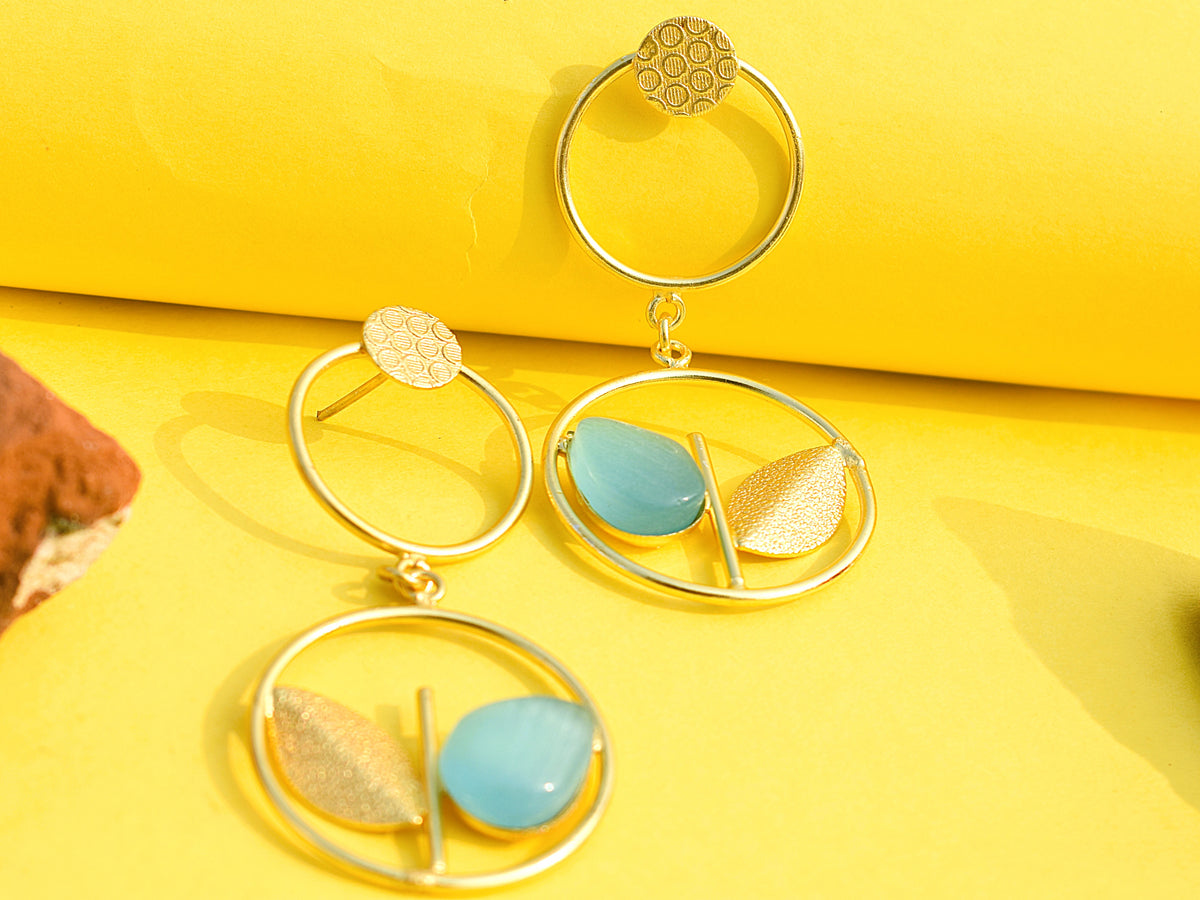 Gold-polished earrings with cyan stone to highlight and rounded design with gold leaf on the other side for playful sparkle. Lightweight, trendy, and made for effortless everyday slay.
