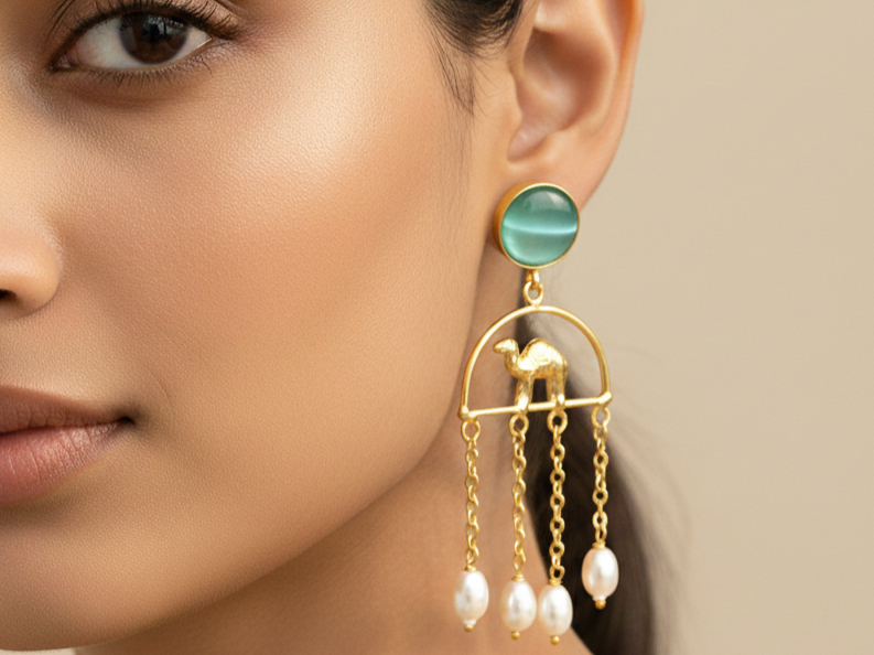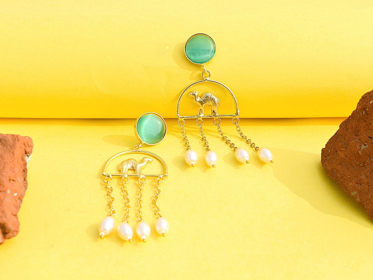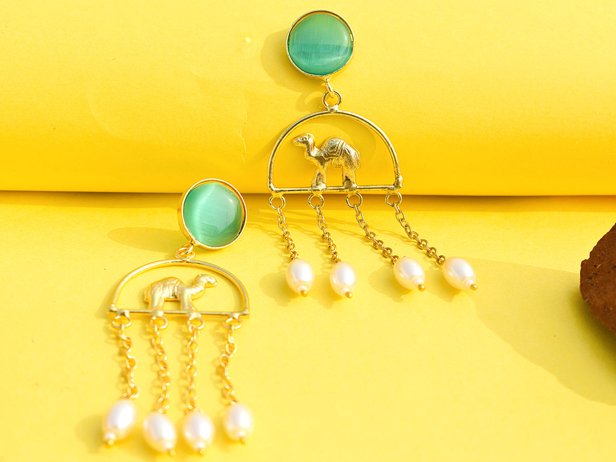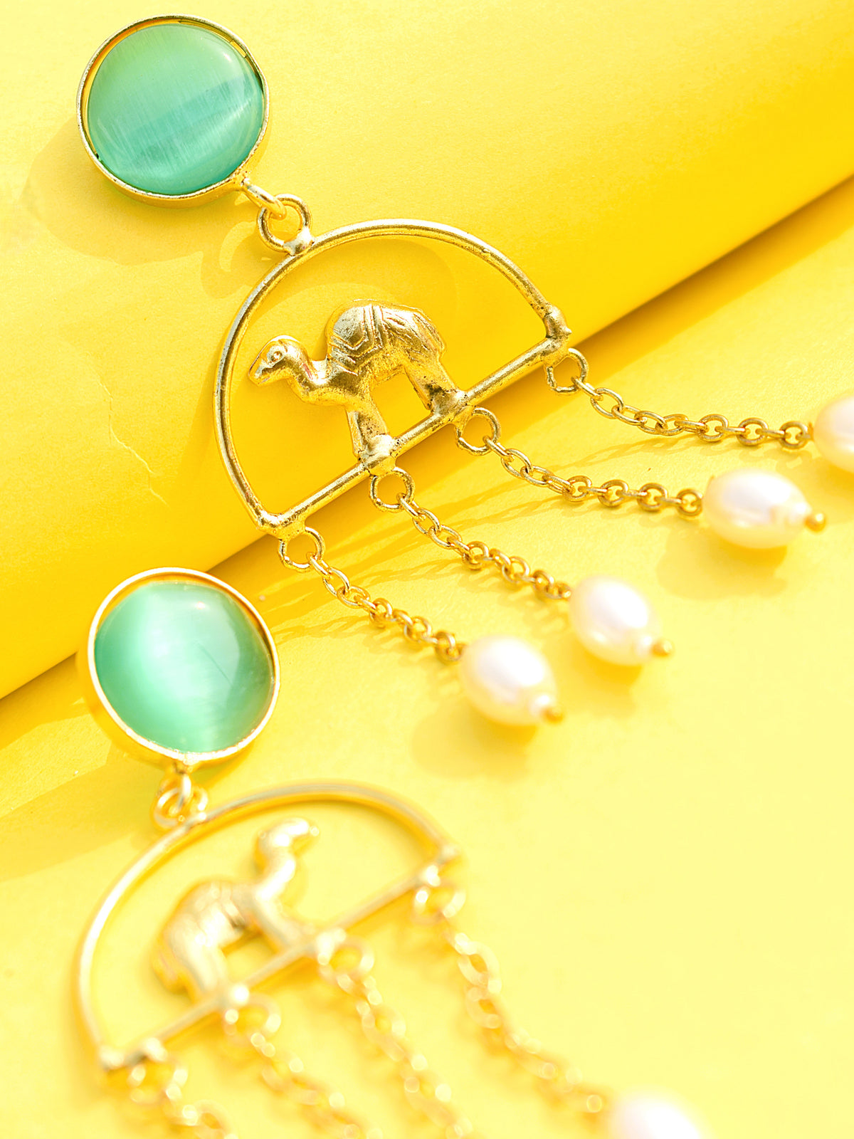Gold-plated Camel designed Small jhumka earrings accented with a fresh cyan stone at the centre, finished with gold latkan detailing for a vibrant ethnic look.