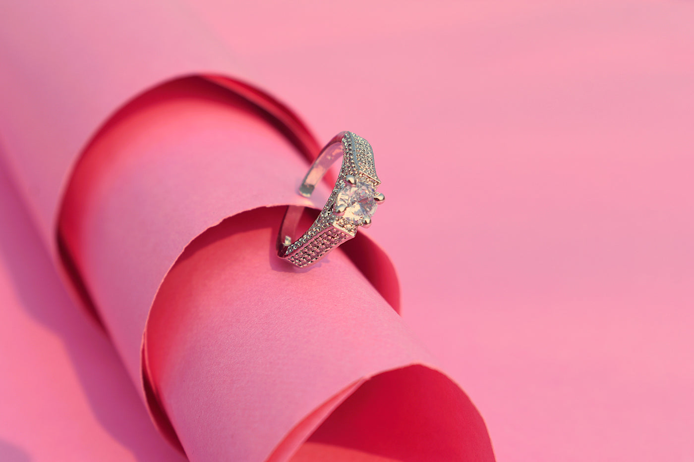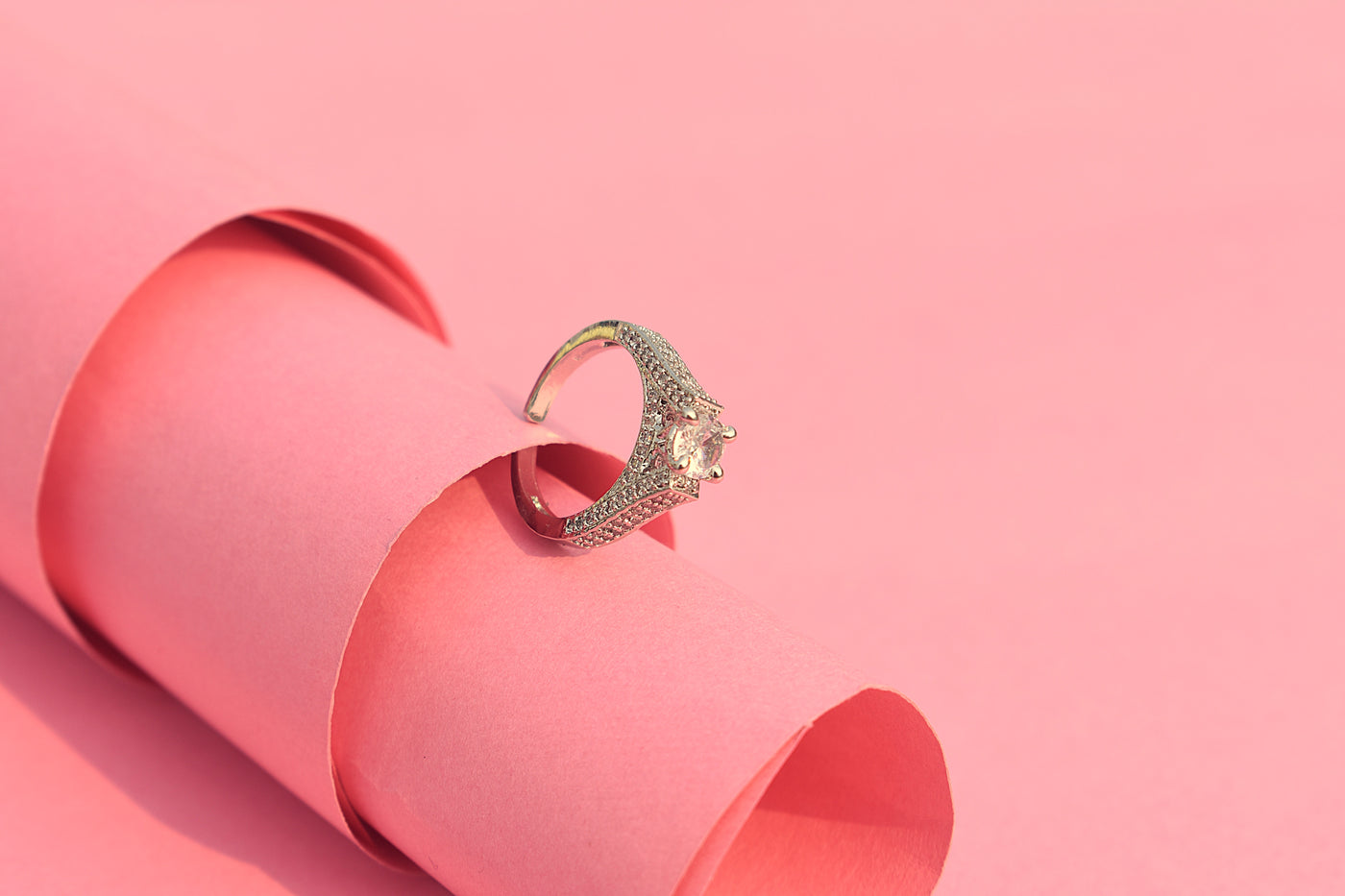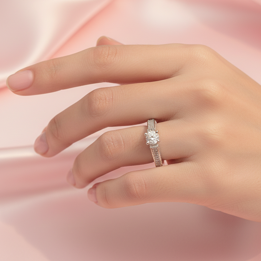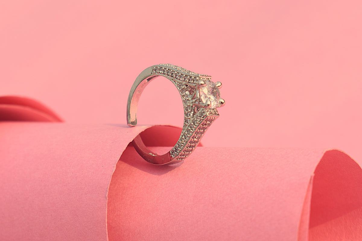 Sleek and modern, this silver-polished artificial diamond ring features soft white stone accents.