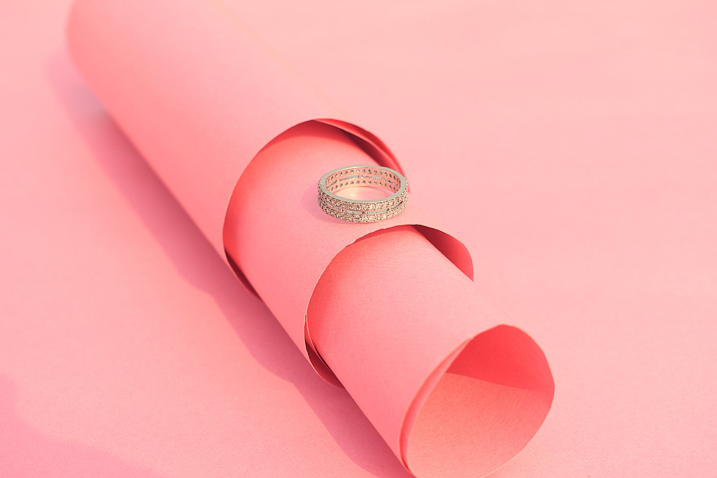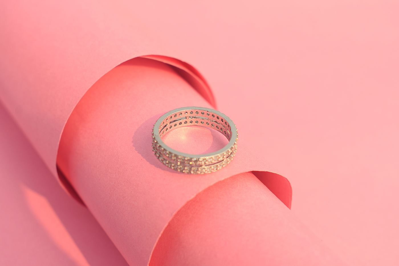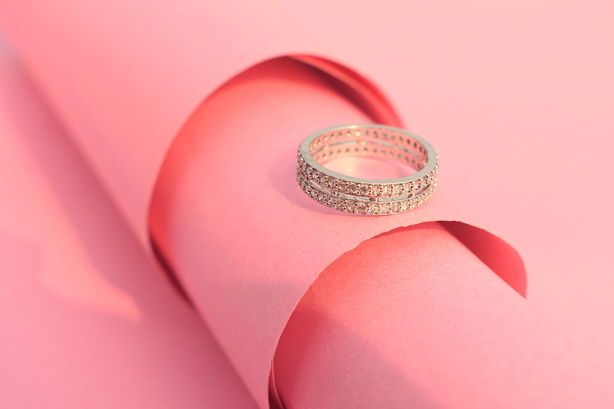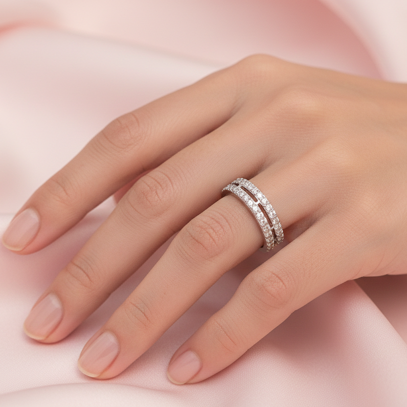 A beautifully crafted artificial diamond ring with soft white stone accents and a polished silver finish.