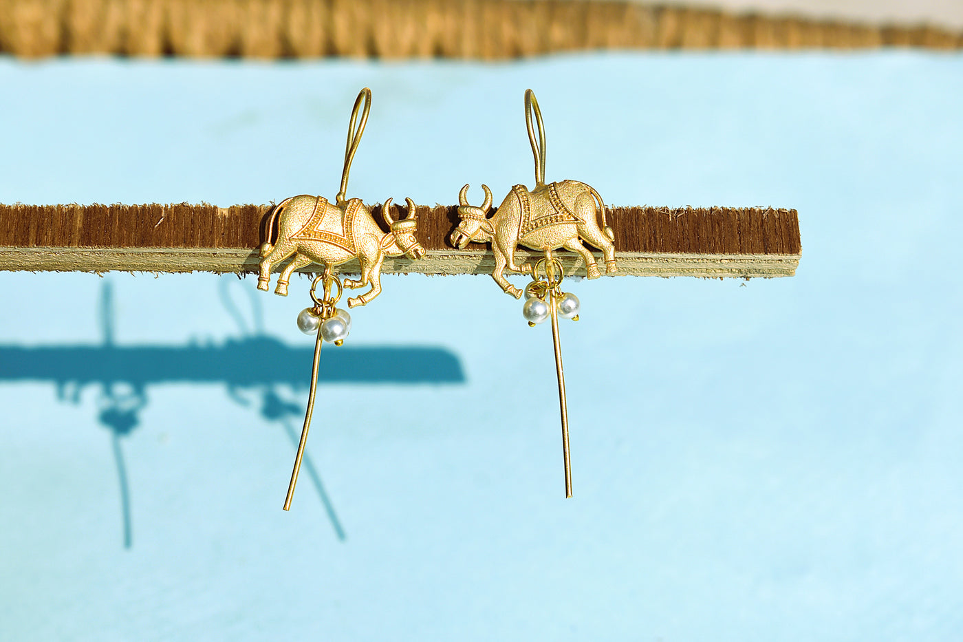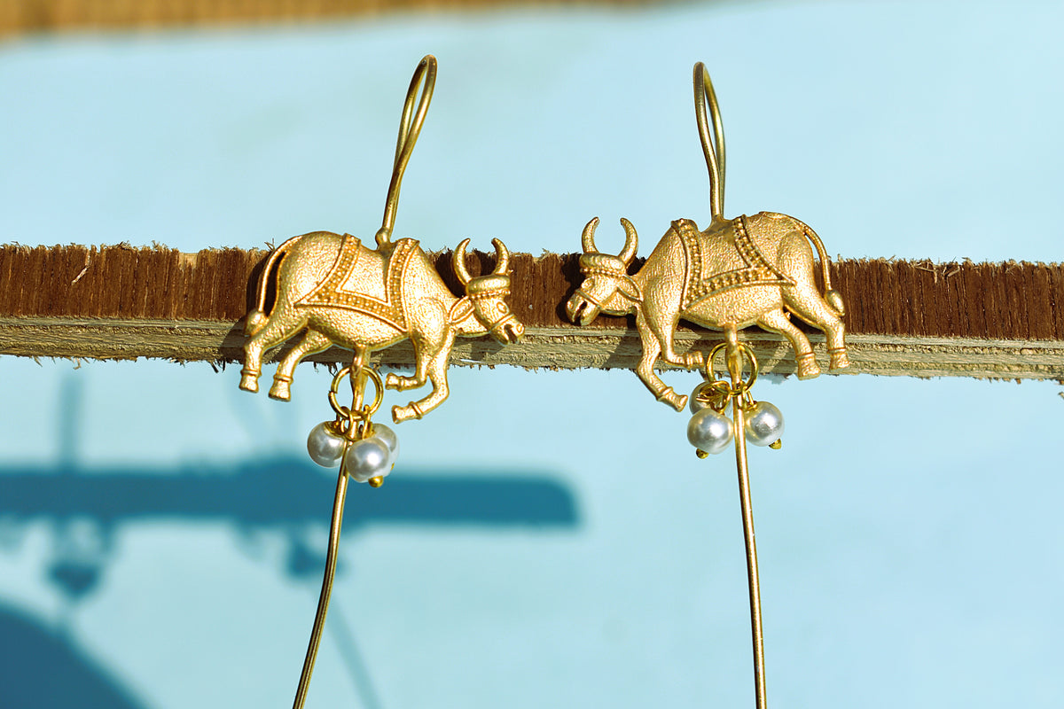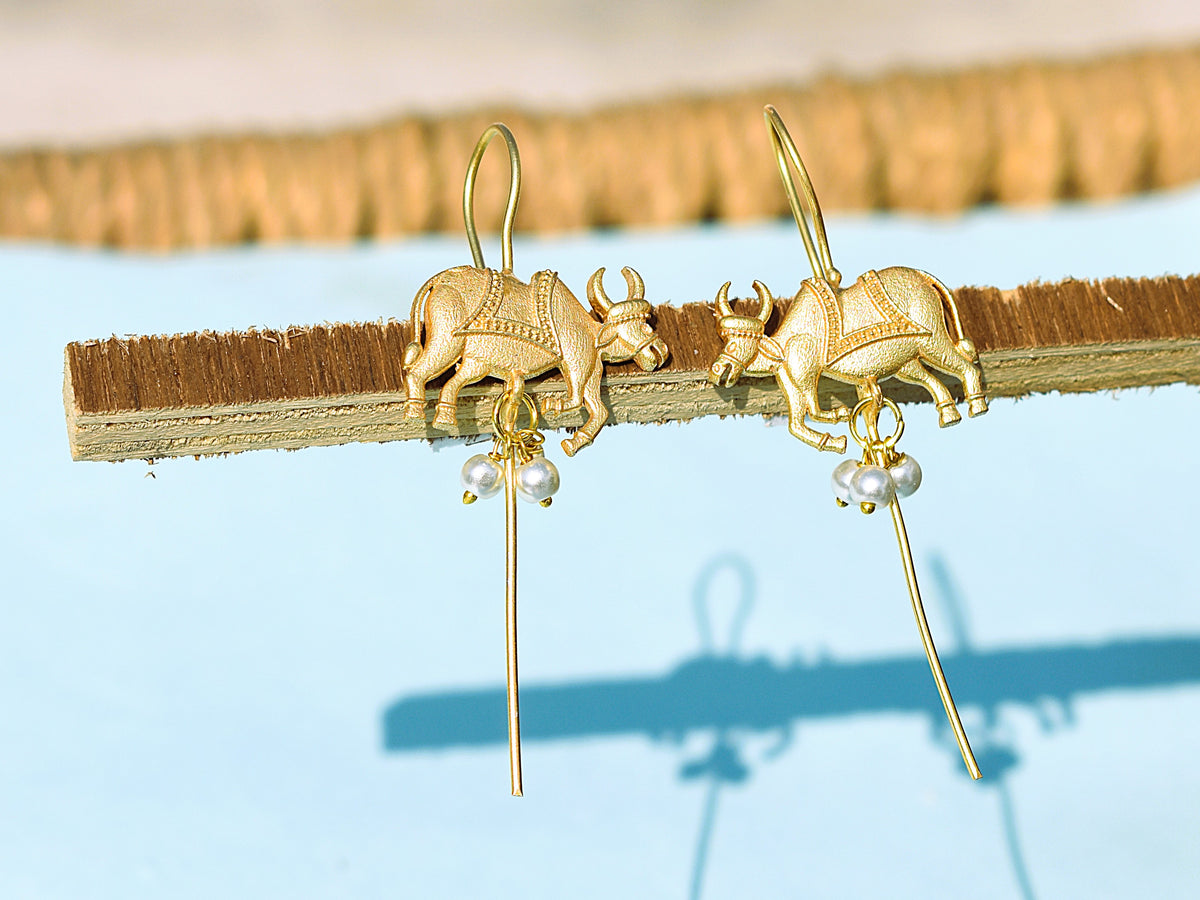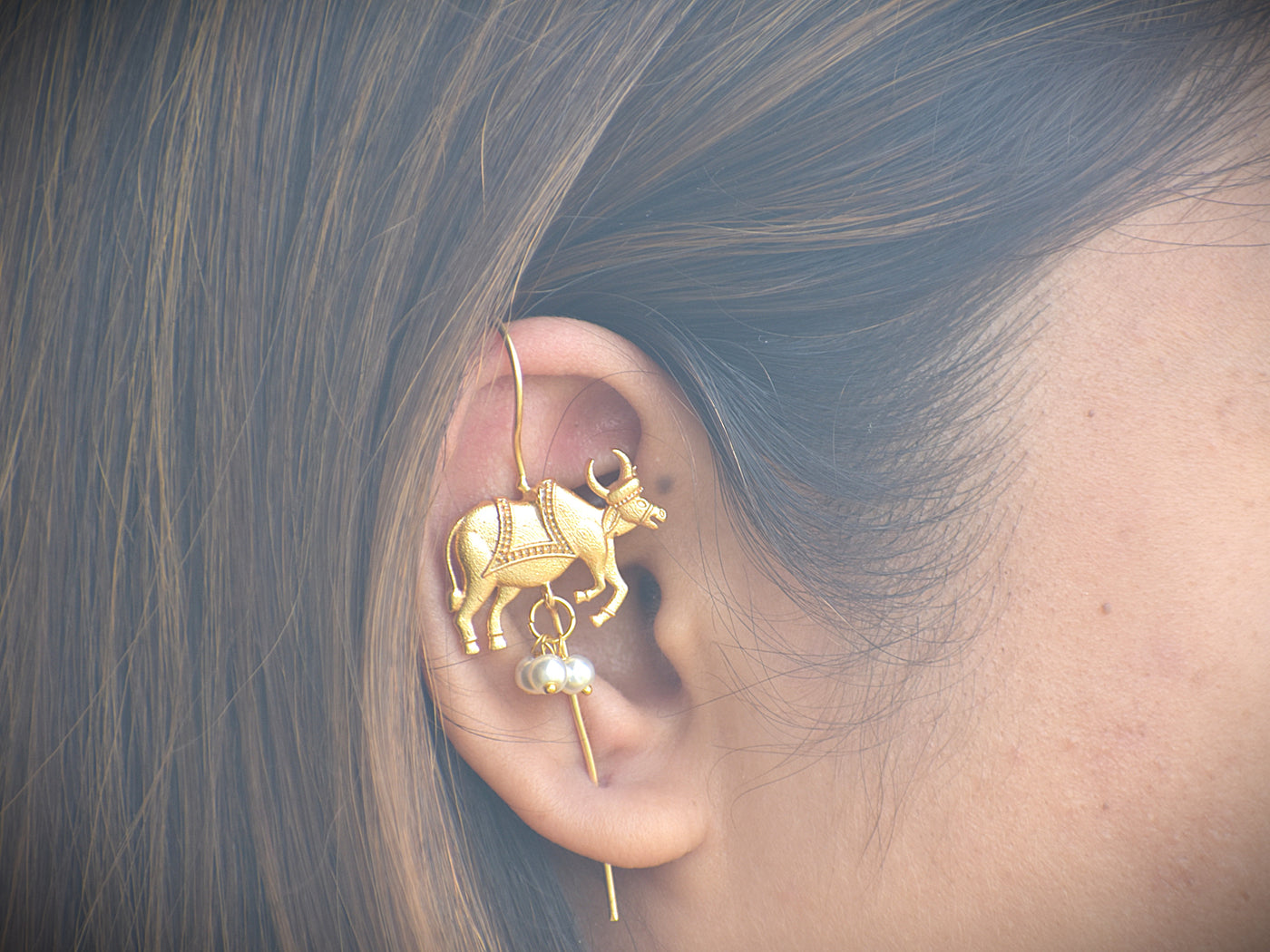 Gold-plated cow motif Earcuff with white latkan inspired by tradition and divinity, designed for cultural occasions and statement looks.