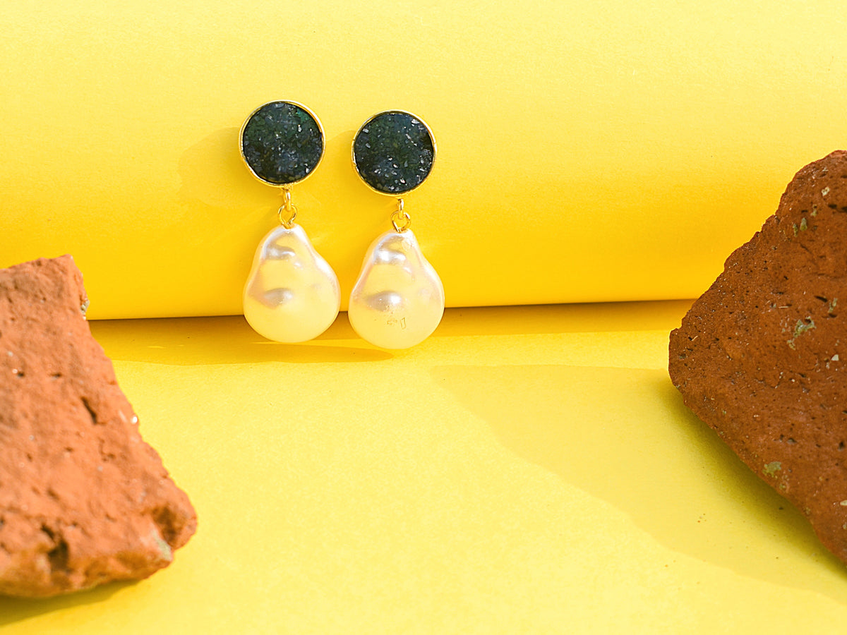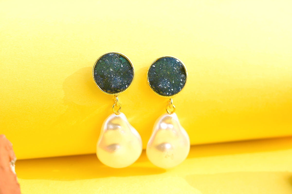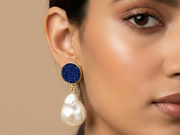 Gold-polished earrings with a striking blue stone design and a white drop, offering a fresh pop of colour with timeless elegance.
